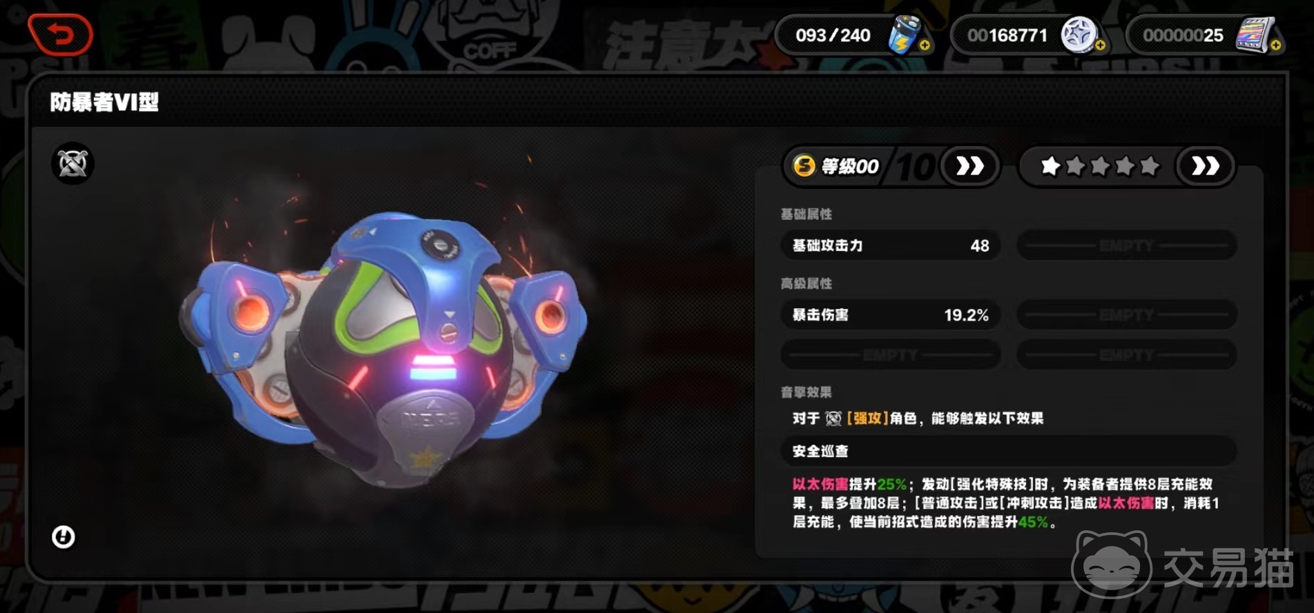 防暴者VI型属性方面已经达到了s档次,所以在强度方面绝对值得信赖,它是精英小队标准配备的最新战术道具,拥有强劲的以太供能功率。先来看一下它的基础属性,在达到满级和满星状态下,基础攻击力为714,暴击伤害48%,还拥有安全巡查效果,提高50%的以太伤害,在发动强化特殊技时,为装备者提供8层充能效果,最多可以叠加到八层,利用普通攻击造成以太伤害时会消耗掉一层充能,提升当前招式所造成的伤害,最多能提升90%。