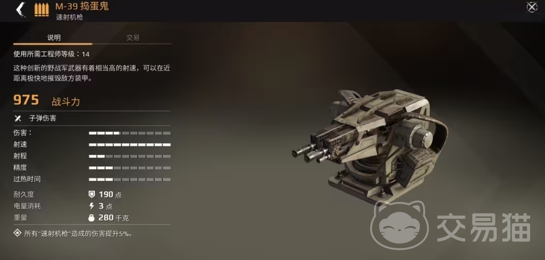 首先为大家推荐的机枪是M39捣蛋鬼。这个机枪的特点就是射速极快,并且伤害很可观。而且这个机枪还有伤害加成特性,整体输出能力极强。然后这个机枪耐久也很高,并不怕和敌人对射。