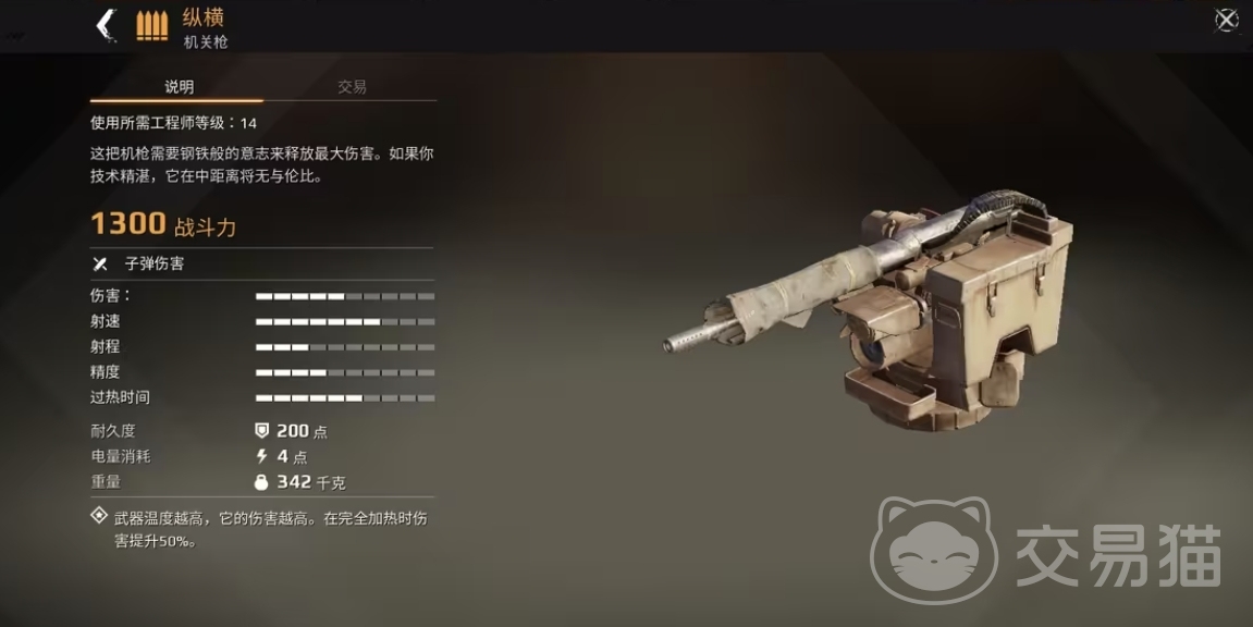 然后为大家推荐的机枪是纵横重型机枪。这个机枪的伤害比M39要高一点。自带的特性可以随着武器温度的升高,提高武器伤害,最高加成高达百分之五十。这也是这把机枪强力的原因之一。然后这把机枪精度很高,玩家操作好的话,可以精准攻击敌方战车弱点,造成大量伤害。