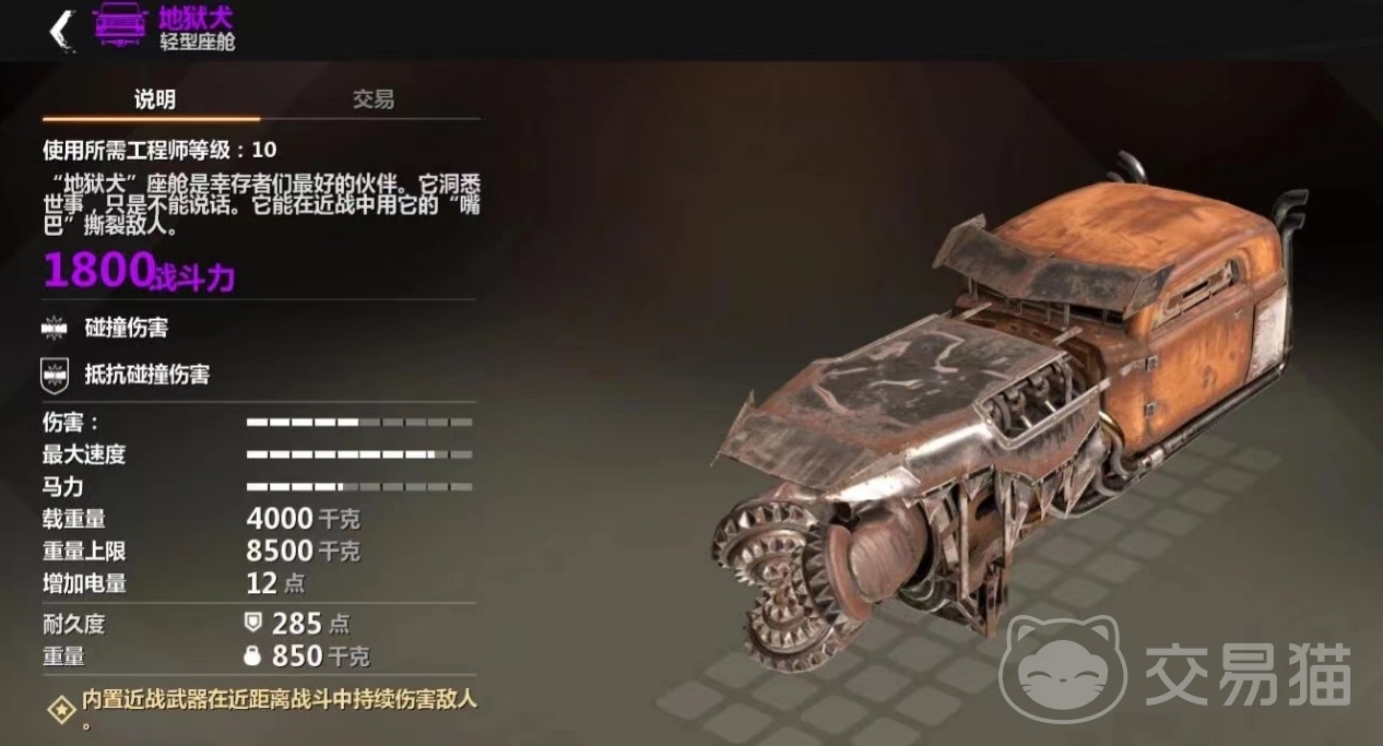 首先为大家推荐的车头是地狱犬车头。这个车头的特点就是它车头自带近战武器,可以对紧挨的车辆直接造成伤害。由于是轻型座舱,这个车头的速度很快,灵活性极高。这个车头的耐久也不错,将近300点耐久,在轻型座舱中属于很高的一个数值。
