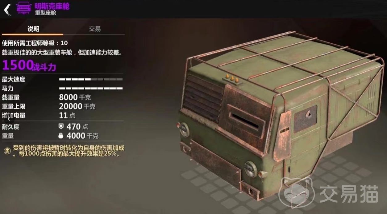 然后为大家推荐的车头是明斯克座舱,是一个重型座舱。这个车头的最大速度并不高,但马力很足,可以让车辆很快就能达到最大速度。这个车头的特点就是耐久度高,有470点,特别耐打。最重要的是它有一个增伤特性,可以将所受到的伤害转换为输出加成,这就太强了。很多玩家都会因为这个特性再加上它耐打而选择用它。