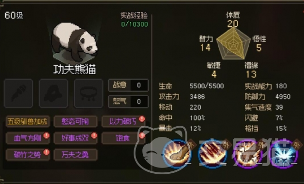 只不过这个熊猫外表比较可爱,但是整体的能力会比较弱一些,熊猫体质和智力比较强,但是敏捷和悟性很差,如果想要让熊猫作为宠物的话,玩家就需要够接受熊猫移动速度慢这个特性,不过相对来说熊猫的生命和防御能力是比较优秀的,如果在游戏中遇到了需要战斗的情况,这个熊猫也可以帮助玩家出击。