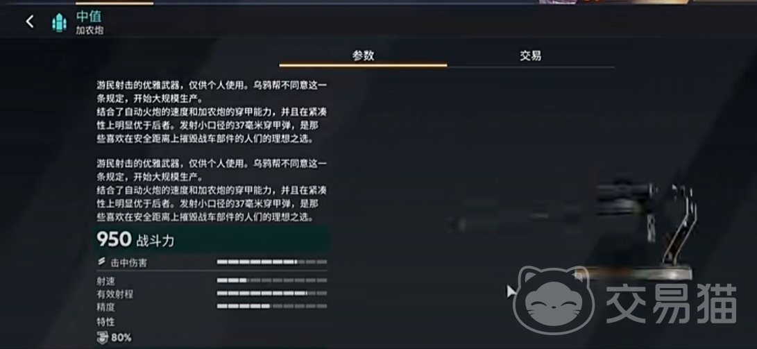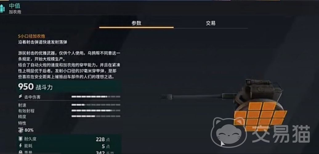 中植在加农炮武器中是一把绿色品阶的加农炮武器,这把武器和复仇者加农炮存在着很大的不同之处,这把武器是一把定位于理你准星的武器,比较适合中远距离的阵营使用,从中植的属性面板中也可以发现这把武器只有击中伤害没有爆炸伤害,从伤害类型来说这把武器更像是一把大口径的狙击枪,武器的射速比较普通拥有4秒的换弹时间,耐久度则更低了,228的耐久度在所有的绿品阶的火炮武器中是耐久度最低的,这也就说明中植更加容易被缴械。