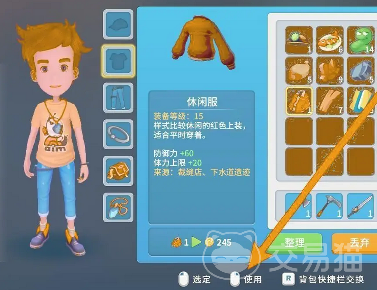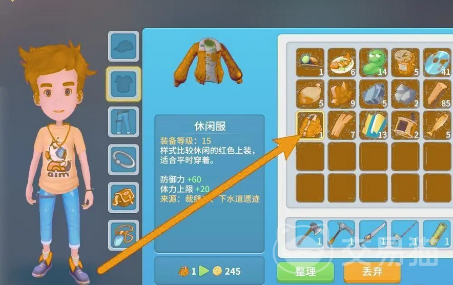 接着在背包中浏览你拥有的物品,可以找名为“休闲服”的服饰。