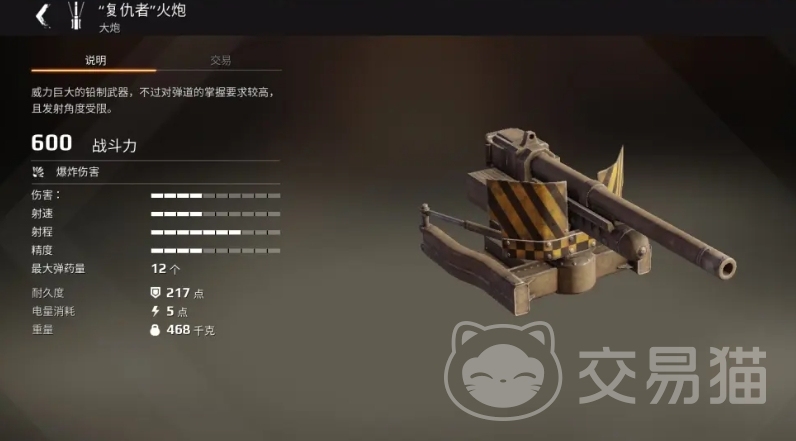 复仇者:这个武器其实是新手的福音,它冷却速度快,子弹数量多的同时体积也不大,整体的重量轻,用起来成本还低,对新手来说方便得不行,对于刚入门的玩家来说,超级容易上手的同时输出也有的,不过在耐久度上面是不算高的,伤害对比其他的同类武器用起来也稍微有点低,但大家刚换加农炮的时候用起来效果还是不错的。