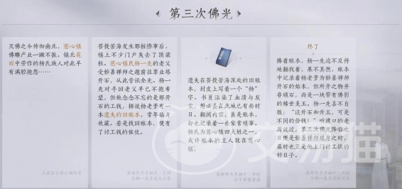 以上就是燕云十六声第三次佛光任务的完成方法分享,这个任务整体还是比较简单的,物品和人物都不算很难找,想完成任务的小伙伴,可以依照文中的步骤来做,相信大家都能完成任务获得奖励。