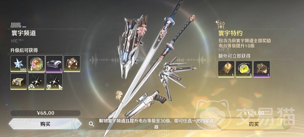 电台奖励这一块分为大众频道和寰宇频道,而寰宇频道有进阶的寰宇特约,一个68元一个128元,128元档的可以帮助多升10级。大众频道是免费的,得到的材料自然要少一些,寰宇频道会有一些额外的抽卡奖励。
