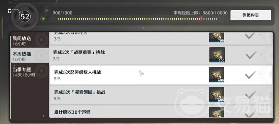 大多时候只要将体力消耗完毕,每日的材料基本上是能拿齐的,而每周的按照上述方式去认真收集也是比较好入手的。当季放送则是要完成一些特殊的挑战,主要注意单周的经验上限是10000点,可以升10级。