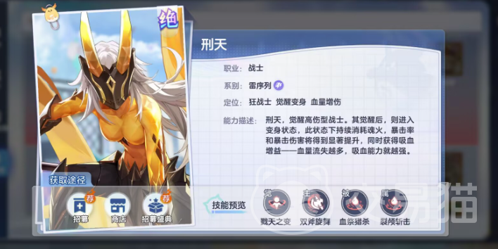 刑天,雷系毕业C,血越少伤害越高,觉醒后提升明显,攻击加双暴提升,有吸血,且技能附带对方最大血量伤害,克制坦克,360°无死角战士。