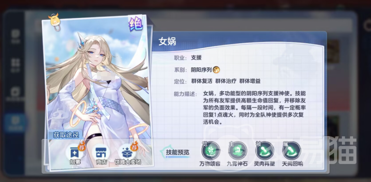 女娲,独一档的支援角色,有复活有治疗有增益,给所有队友加属性,全体治疗和净化,独特的复活机制能保队友2次,什么阵容都可以搭配,有了它难度大大降低。