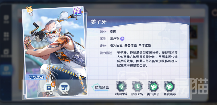 姜子牙,雷队的毕业辅,对策卡,控制能力很强,群体眩晕加易伤,主动技可以将敌人拉过来眩晕实现速杀。不仅如此,他也能给全体加暴击提升魂火回复速度。