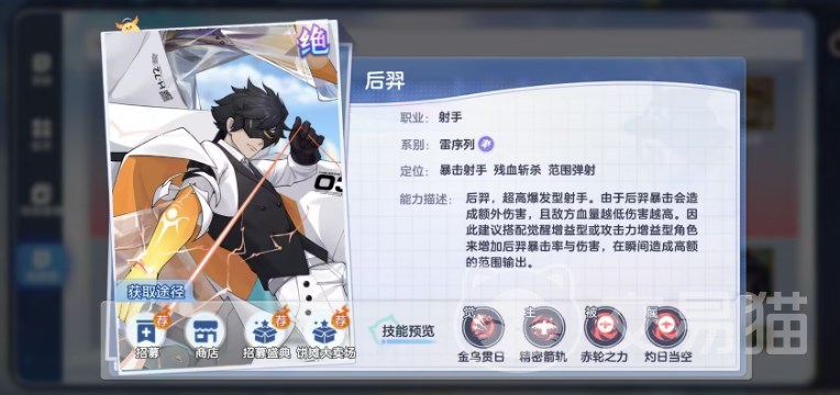 后羿,雷队毕业C,爆发极强,敌人血越少伤害越高,很适合打收割,搭配上增益型的队友提升暴伤,收益更大。