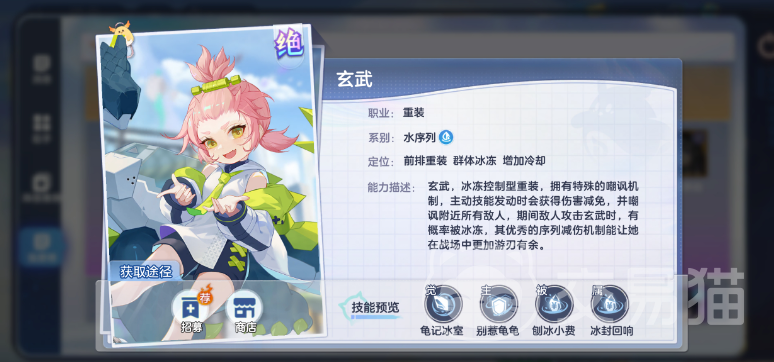 玄武,有冰冻能力,是最契合冰冻队的前排,冰冻敌人越多自身防御越高,本身有高额免伤和嘲讽,并且可以降低敌人的冷却回复,可以很好地控制住敌人并减缓对方释放技能的速度。
