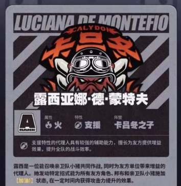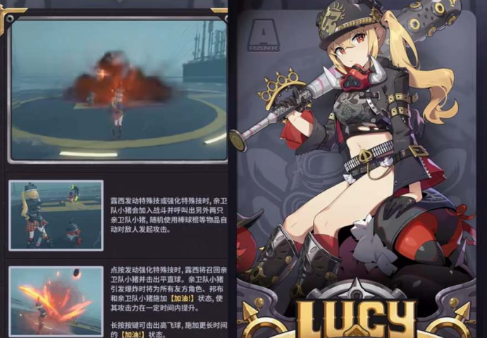 露西的特殊技是召唤出几只小猪加入战斗,同时使用棒球棍对敌方发动一次攻击。而强化特殊技则是召回小猪,然后用棒球棍击出,在小猪爆炸的时候,会给其他的小猪和队友增加一个提升攻击力的BUFF。而露西的大招则是一个比较高额的输出技能,将所有小猪全部打出,从而造成大额的火系伤害,很适合用来补充队伍的输出。