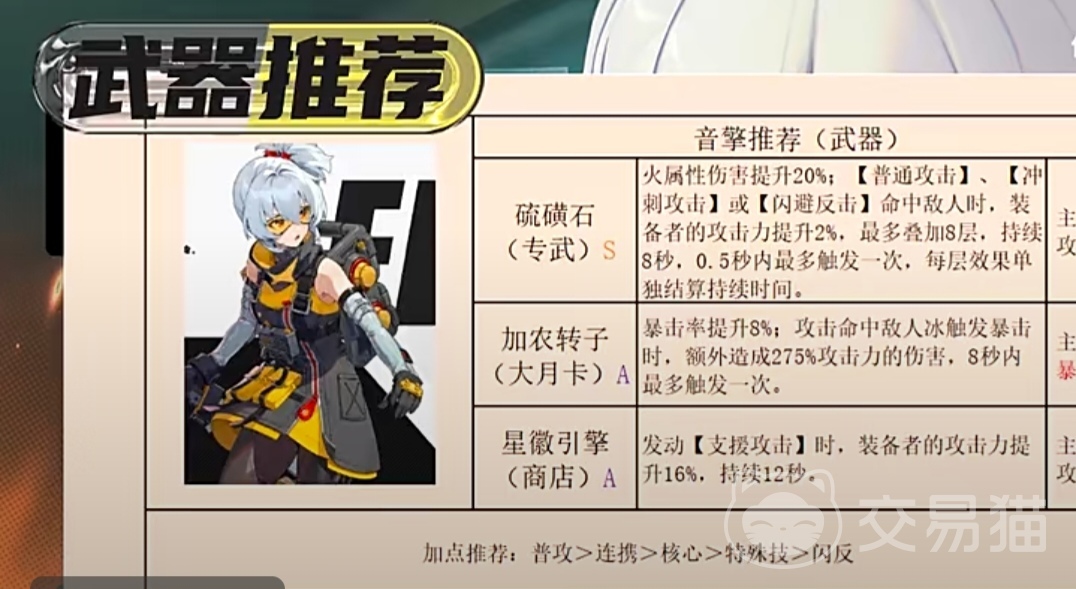 11号在选择武器时建议给她选择专属武器,在当前这个阶段,专属武器是11号的最好选择,专武可以提高装备着2%的攻击力,火属性伤害可以提高20%,其次也可以选择大月卡武器加农转子,加农转子可以提升角色8%的暴击率,每一次命中敌人都会给敌人造成275%的额外攻击伤害,至于商店兑换的紫色武器目前不建议11号装备,这件紫色武器不仅不适合11号使起来甚至还有一些冲突。