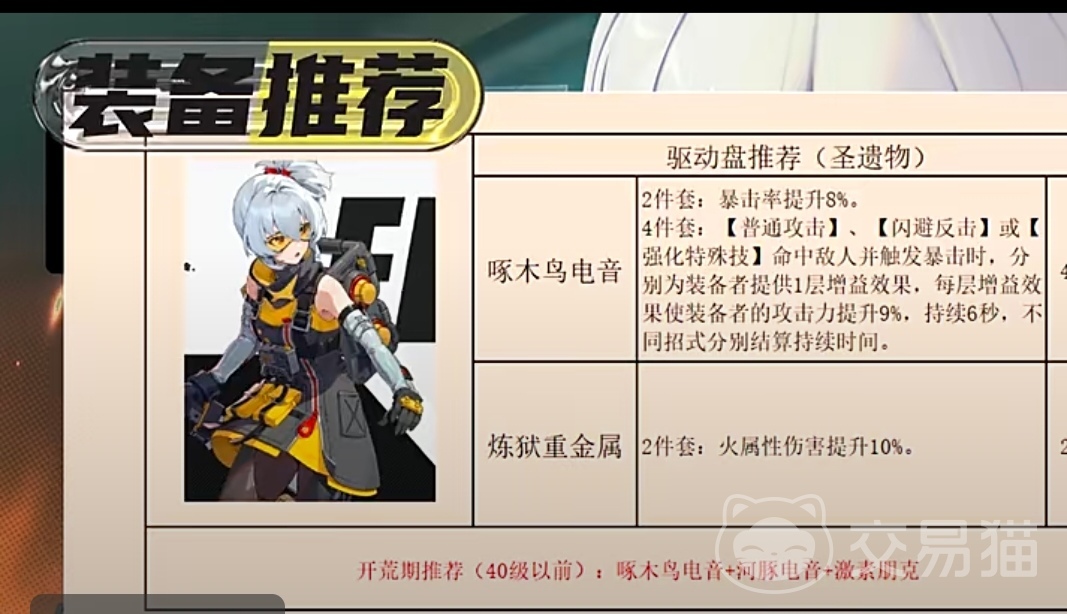 玩家在游戏开荒时间也就是40级以前建议装备可以选择啄木鸟电音+河豚电音+激素电音,等角色等级到了40级以后可以选择啄木鸟电音4件套加上河豚电音两件套。