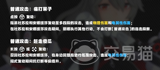 丽娜的普通攻击可以通过配合人偶的攻击,然后以自身为中心造成范围电属性伤害。即使在人偶攻击期间进行其他动作或换人,也不会打断人偶的攻击,这使得丽娜能够有效地为在场的队友提供增益。而特殊物技和强化特殊技则能进一步提升她在战斗中的支援作用,包括召唤人偶造成电属性伤害、提升抗导弹能力以及触发其他角色的快速支援技能。特别需要注意的是,强化特殊技使用后应将丽娜放置在主C前一号位置,以产生最大化效果。
