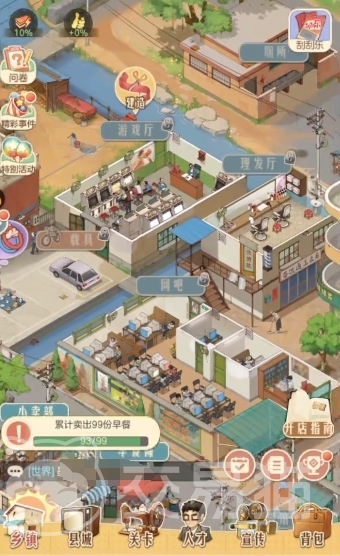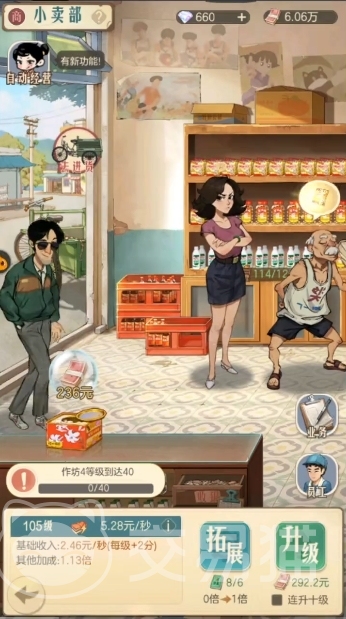 前期的升级还是比较简单的,但是需要选定一个比较有潜力的商铺,而且投入更多的培养资源,比如优先选择主要培养的人才进行商铺升级和扩展,这样也是可以快速增加总收入的,其次上面店铺的开启与关卡进度是关联的,而每个店铺的赚速其实也是有规律的。
