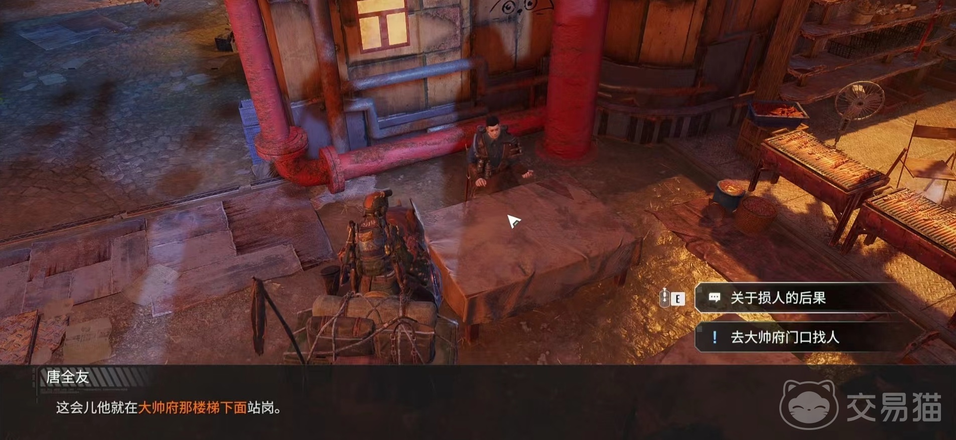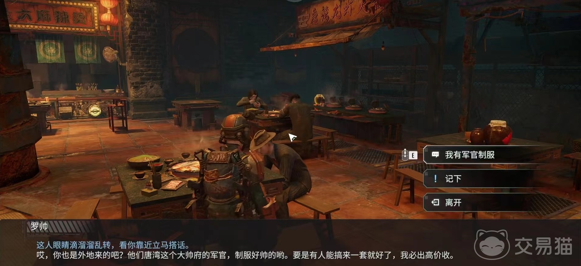 狐假虎威任务是发生在唐湾地图中的一个支线,大家打开唐湾地图,在唐湾饭店中找到罗帅接取任务。此时罗帅正在一张桌子旁吃饭,对话后他会让玩家去找唐湾军服和配枪,这样才能解锁后面的剧情任务,所以该任务与其他任务是相关的。将找到的军服交给罗帅后,他换上了军官制服。跟随后续的任务指引完成剧情,看到罗帅被关到笼子里,需要一把钥匙去救他。在旁边的杂货商人那里就可以直接购买钥匙,打开笼子将狐假虎威任务完成。