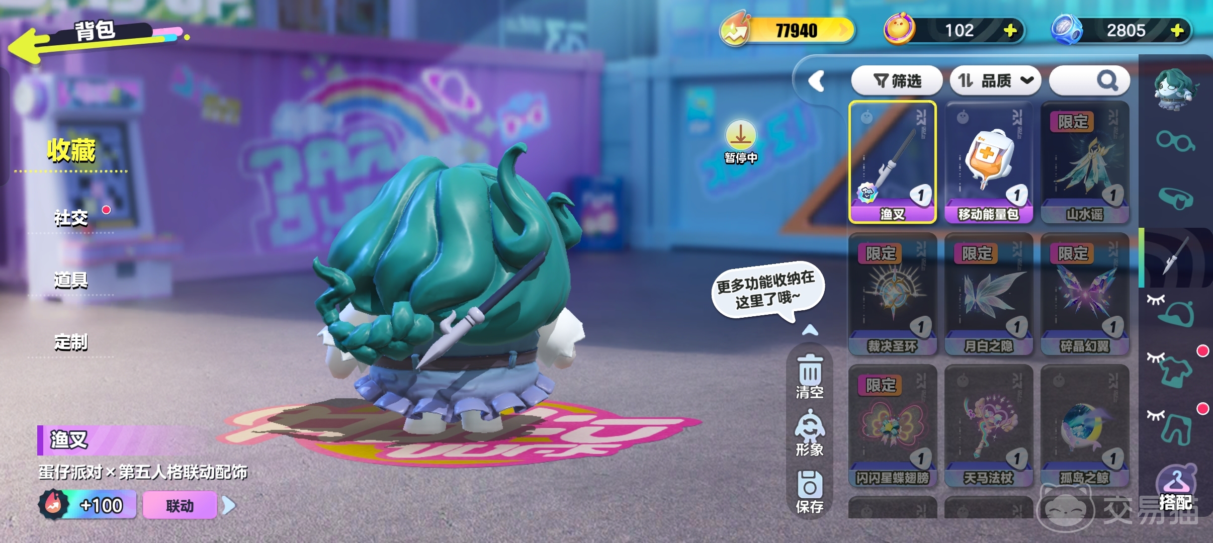 最后小编就来带大家了解一下第五人格蛋仔派对第二次联动的配件吧。通过抽取皮肤时的转盘,有机会抽取到渔女宝宝的武器“渔叉”和第五人格相关配饰“深林提灯。大家可以根据自己的喜好来进行搭配。比如不喜欢高度贴合第五人格形象的渔叉,我们可以在收藏-配饰一栏进行更换。需要注意的是,第五人格相关皮肤只能搭配第五人格相关配饰哦。