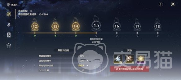 首先我们来聊聊数据坞等级。玩家可以把它想象成一个技能树,只有不断给它“浇水施肥”,也就是提升等级,才能解锁更高级的技能,也就是五星声骸。那么,怎么提升等级呢?其实每次玩家解锁一个新的声骸或者提升已有声骸的品质,都会给数据坞带来经验值,让它升级。特别是当玩家的数据坞等级升到15级时,就打开了通往五星声骸的大门,这就是一个门票。