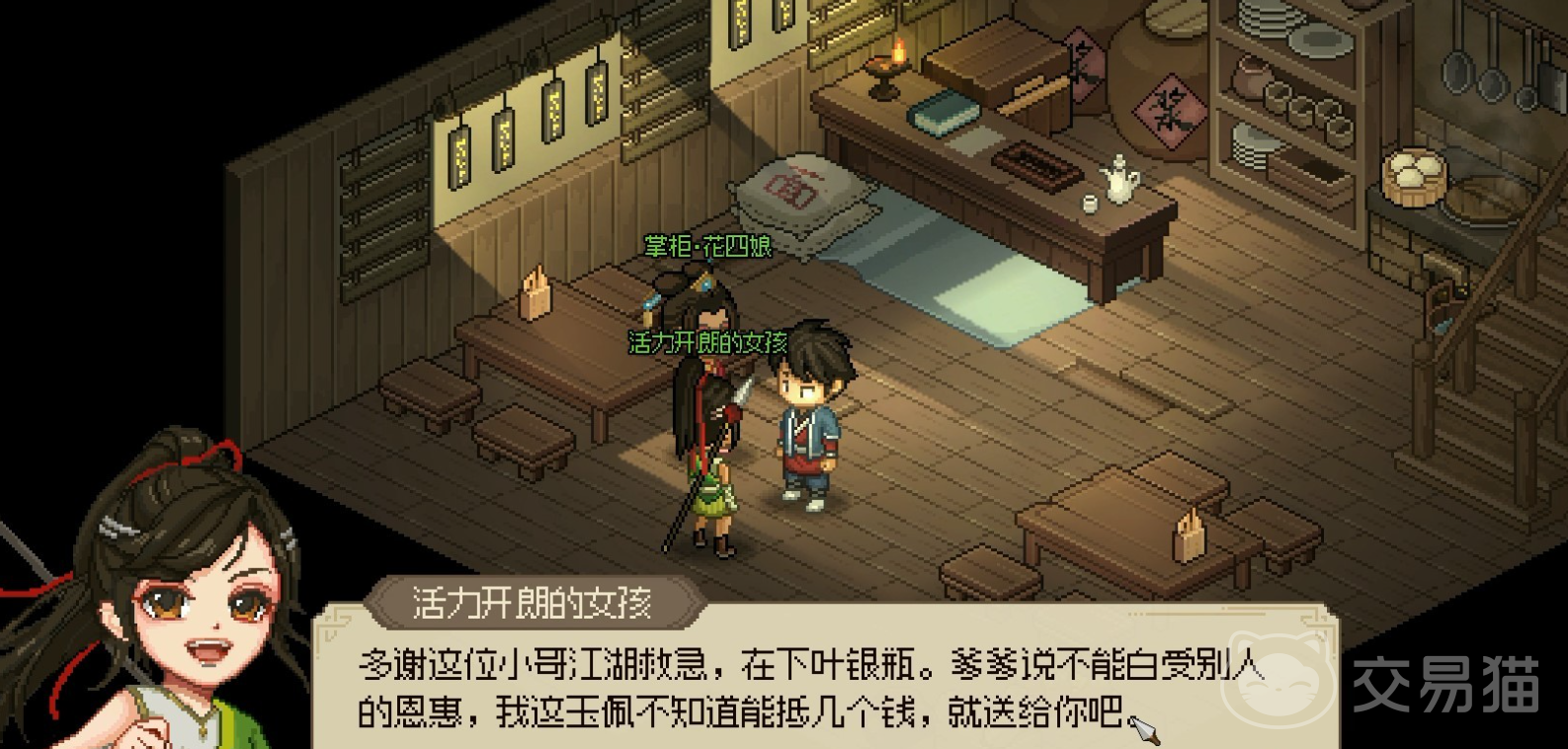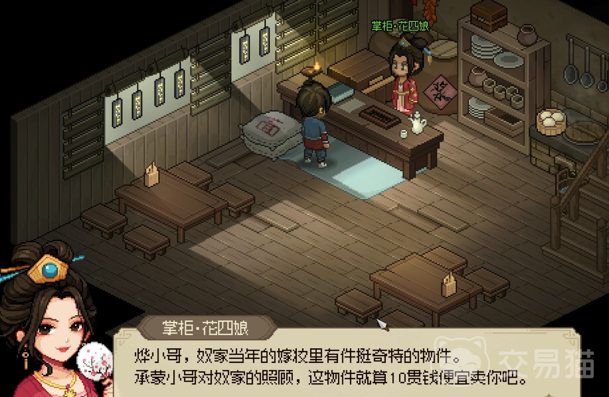 花四娘是无名客栈的老板娘,首先我们需要先提升送东西提升好感度,只要好感度到了59就会直接触发黑衣人任务,这个背景是黑衣人们曾经袭击过她,导致其父亲还有未婚夫死亡,自己也受了重伤,为了查出真相和报仇需要我们寻找黑衣人的线索,其实这个黑衣人就是玄衣会的组织,玩家可以去大梁赌坊的后院找到玄衣会的老大,将他打赢后,他就会透露黑衣人的真实身份其实是康王府的主簿;