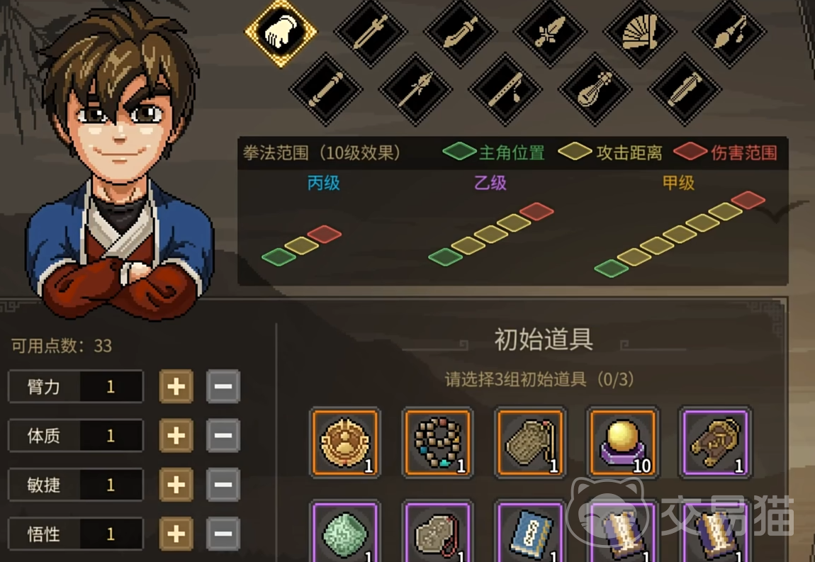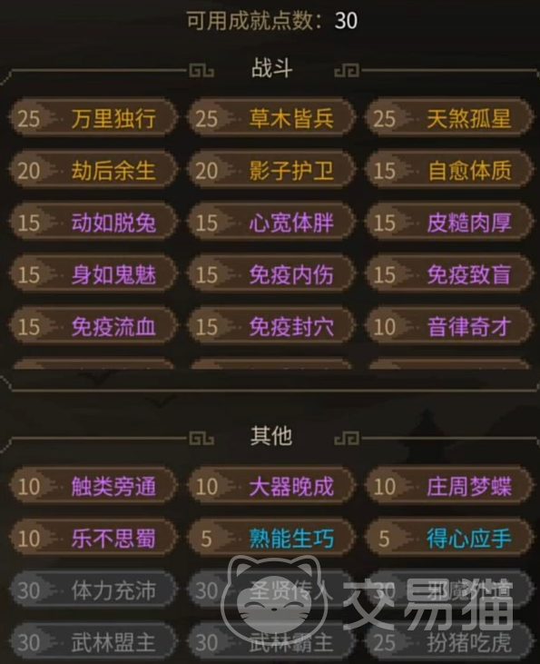 第三个是初始道具,休闲和普通模式下可以选择三组初始道具,这个也是自由选择。最后一个则是人物特征,我们一开始有30点点数,在战斗和其他之中我们可以消耗点数进行选择。如果是休闲模式的话,在其他里面还可以解锁很多的身份,比如圣贤传人,国公世子,无师自通等等,这就都是属于非常强力的能力。可以对玩家们接下来的发展起到非常大的作用,但这些也会让我们的难度下降太厉害,所以玩家们尽量不要选择。
