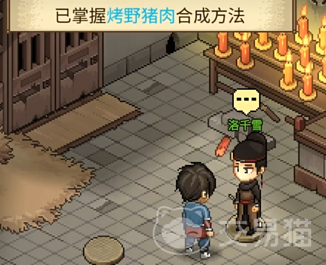之后我们从上方出林子来到破庙。之后和洛千雪对话,如果有野猪肉优先给野猪肉。因为给了野猪肉会直接恢复满体力,并且还可以获取到烤野猪肉的配方。烤野猪肉会给一个BUFF,只要体力在90以上,便会将伤害,防御和轻工提高15%,持续永久。