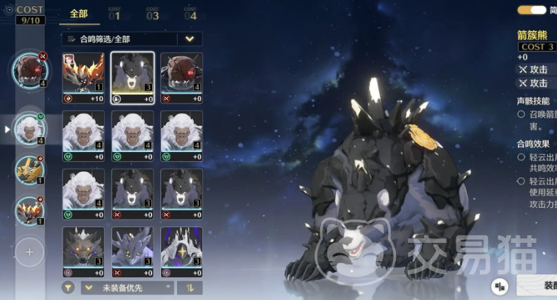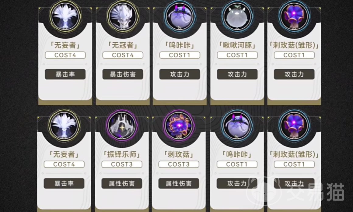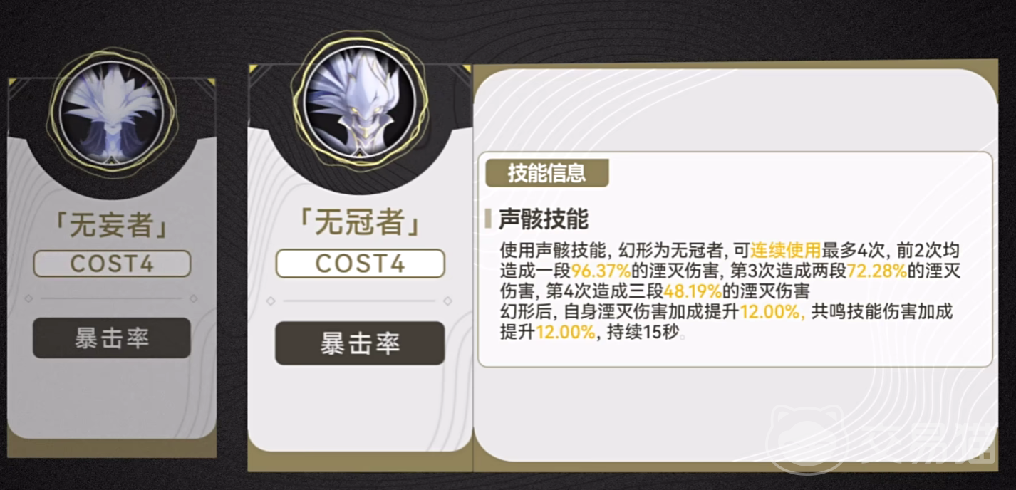当游戏度过了过渡期,玩家可以采用词条之中有暴击或爆伤的金色声骸,例如紫鸟和乐师, 在暗属性的搭配上面,玩家可以更多的选择无冠者这个词条,无冠者这个声骸不仅能够增加暴击率,还能够增加暴击伤害,可以说是后期一个比较强的伤害搭配了,在coaster等级分配方面玩家可以选择4-3-3-1的搭配,也就是使用无冠者四件套, 紫鸟三件套和乐师三件套,最后一个搭配哀声鸟即可。