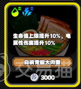 第三个推荐实物是白碗红椒大肉面,这个食物是很多火属性角色必吃的,它可以将生命值上限提升10%,并且将火属性伤害提升10%,售价的话同样是3000银币。第四个白碗青椒大肉面是非常适合女仆长丽娜这种店属性角色去使用的,它可以将生命值上限提升10%,而且将电属性的额外伤害再提升10%。