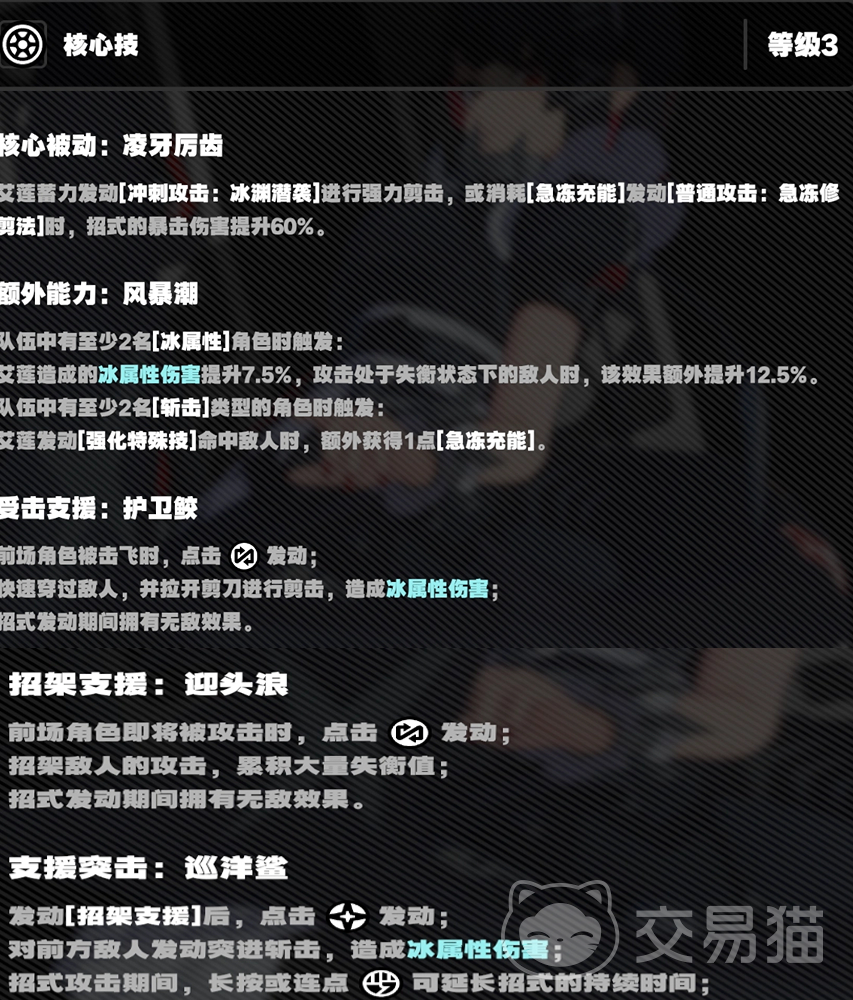 艾莲的闪避技众多,但是概括起来就是通过闪避获得无敌状态,再进行各种各样的反击。而我们重点要说的是艾莲的核心技,艾莲的核心技能和其他角色的核心技最大的不同就是,艾莲的核心技有五种效果,其中的四种属于达到技能的标准后,会给艾莲提供增伤等效果。而第五个状态巡洋鲨则是主要的输出手段了,配合上刚刚说到的增上效果,巡洋鲨这个技能常常能打出不错的效果,从而一招制敌。