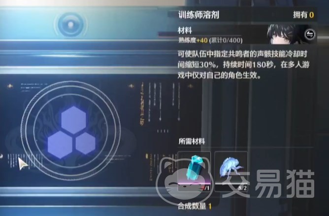 先说下这个训练师溶剂,需要2份隐火蜕制作,可以降低共鸣者30%的声骸冷却时间持续3分钟,有的声骸输出或是功能效果很给力就需要用这个药剂进一步提升它的效果,一般是建议在今州城附近以及无光之森附近采集。