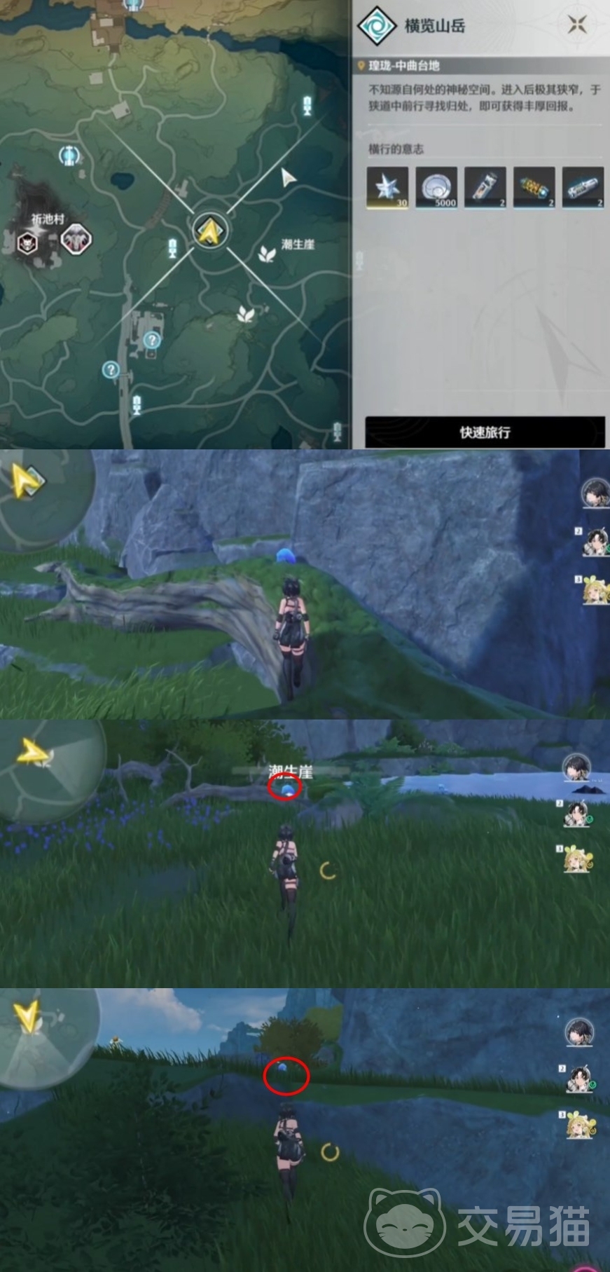 然后打开地图来到“横览山岳”副本的传送点,落地后在地图左边的石壁上就有一个。然后视角转换到地图的右方,在潮生崖的湖边就可以找到一个。然后视角来到地图左下角,爬上山,在半山腰可以看到另一个。