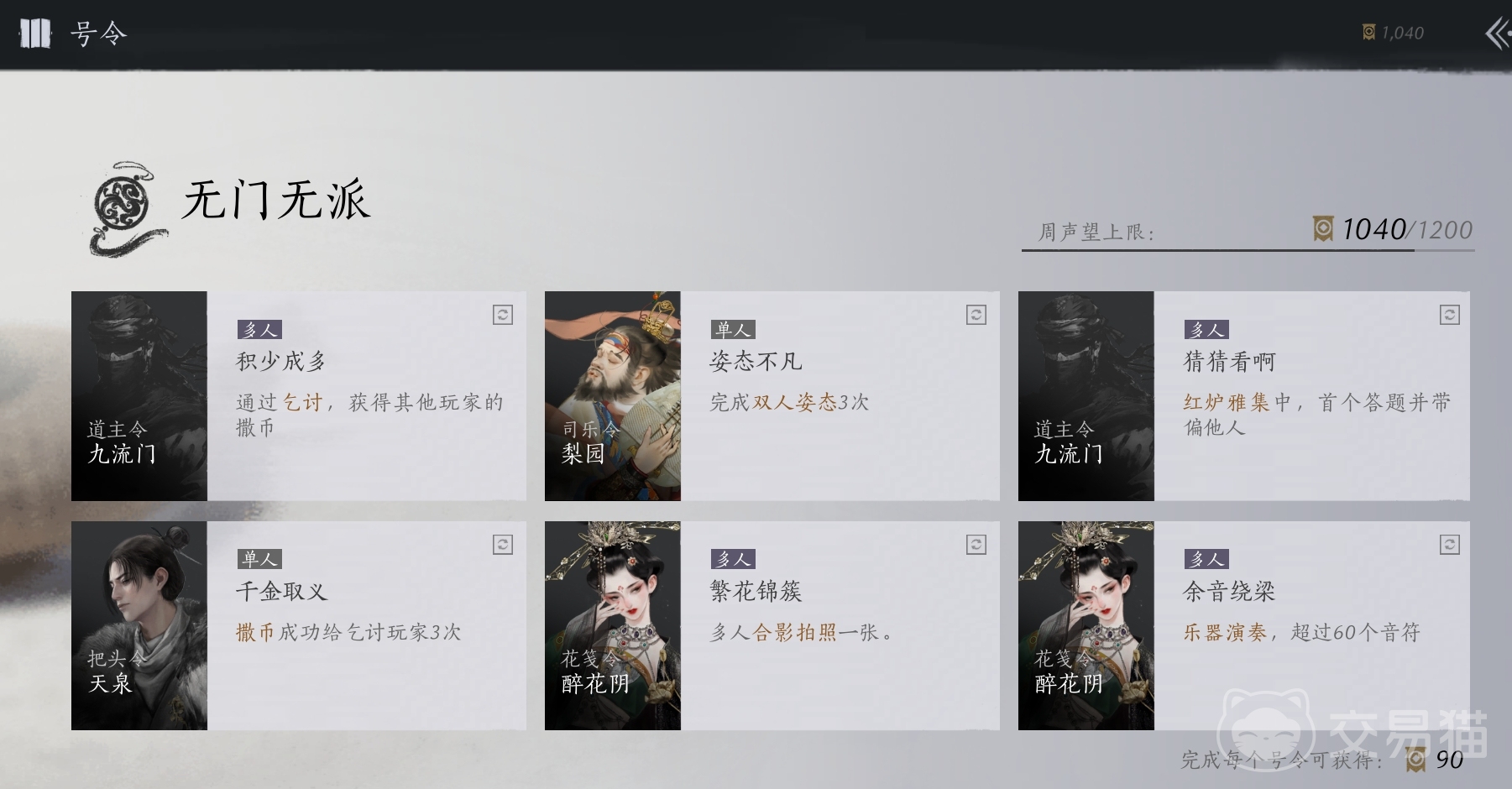 类似“委托”,在主菜单-门派中选择江湖号令,就能够查看到许多门派发布的日常,这里的日常任务大多是比较容易完成的,而且如果遇到自己不喜欢的也可以右上角刷新过滤掉。通过江湖号令的任务可以获得声望,但每天能获得声望是有上限的,其中周末刷的话有三倍声望。