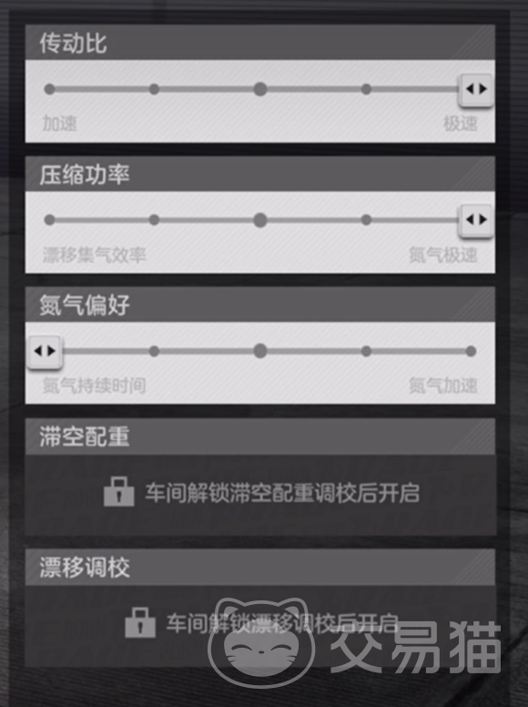 滞空配重是腾空时间,调高的话腾空时间越久,一般调到一二档,但有些地图需要拉满腾空时间。整体调校是551,分别对应三个调校的档位,依次为五档、五档、一档。滞空有五档,但漂移调校只有两个档,默认竞速档为一档,第二档是大世界炫技用,不用解锁。针对长直线地图时,极速和氮气时间拉长,保持高极速,延长氮气时间,在长直道上优势明显。实战时,调到四档,多一点动力效果更好。再说弯道多的地图,如高星图、街区干线、褐谷车站,这些图以弯道为主,长直线少,需要更多动力而非极速。