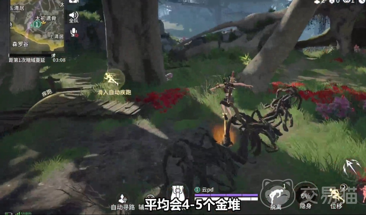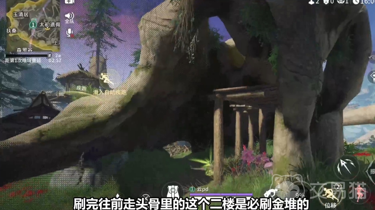 在来到森罗谷后我们可以以太初遗骨的中心位置做为我们的跳点,之所以建议玩家以太初遗骨中心点做为跳点是因为这个地方是整个森罗谷在肥的地方,平均每个位置都会有4个到5个左右的金堆,我们在把太初遗骨的金堆全部刷完之后,千万不要忘记头骨位置的二楼。