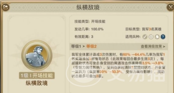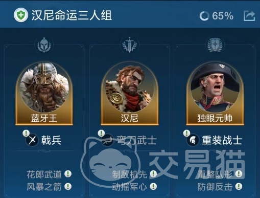 “蓝牙王”的技能“溃败”有几率造成2次伤害,使得队伍更快达到命运触发条件。而“汉尼”的技能则是在我军累计造成3次伤害后,有几率给全军叠加援助效果。援助效果不仅能减伤,还能恢复兵力,大幅提升队伍的生存能力。独眼元帅作为队伍的主要坦克,其高防御和反击技能不仅能有效吸收伤害,还能对敌人进行反击,进一步提高输出。