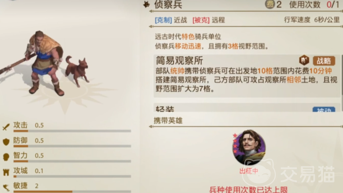 骑兵兵种,有着较高的攻防属性,同时移速很快,不过前期一般没有太多可选的骑兵的兵种,而且骑兵兵种是很吃科技加成和特殊单位的。骑兵克制近战,被远程克制,在游戏前期受限于科技不高,属性不高,但到了游戏中后期,特别是到了铁器时代的时候,骑兵的优点就在战斗中显现出来了,高攻高防,机动性好,生存能力更强。