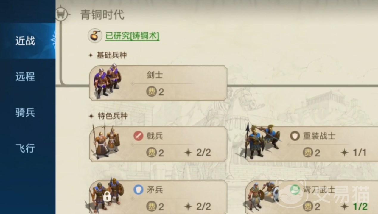 游戏里的兵种主要分为四类,分别是:近战、远程、骑兵、飞行。其中飞行兵种得是在解锁了火器时代后才会开启的兵种。近战克制远程、远程克制骑兵、骑兵克制近战。而飞行兵种则没有明显的克制关系,更多是看兵种属性。