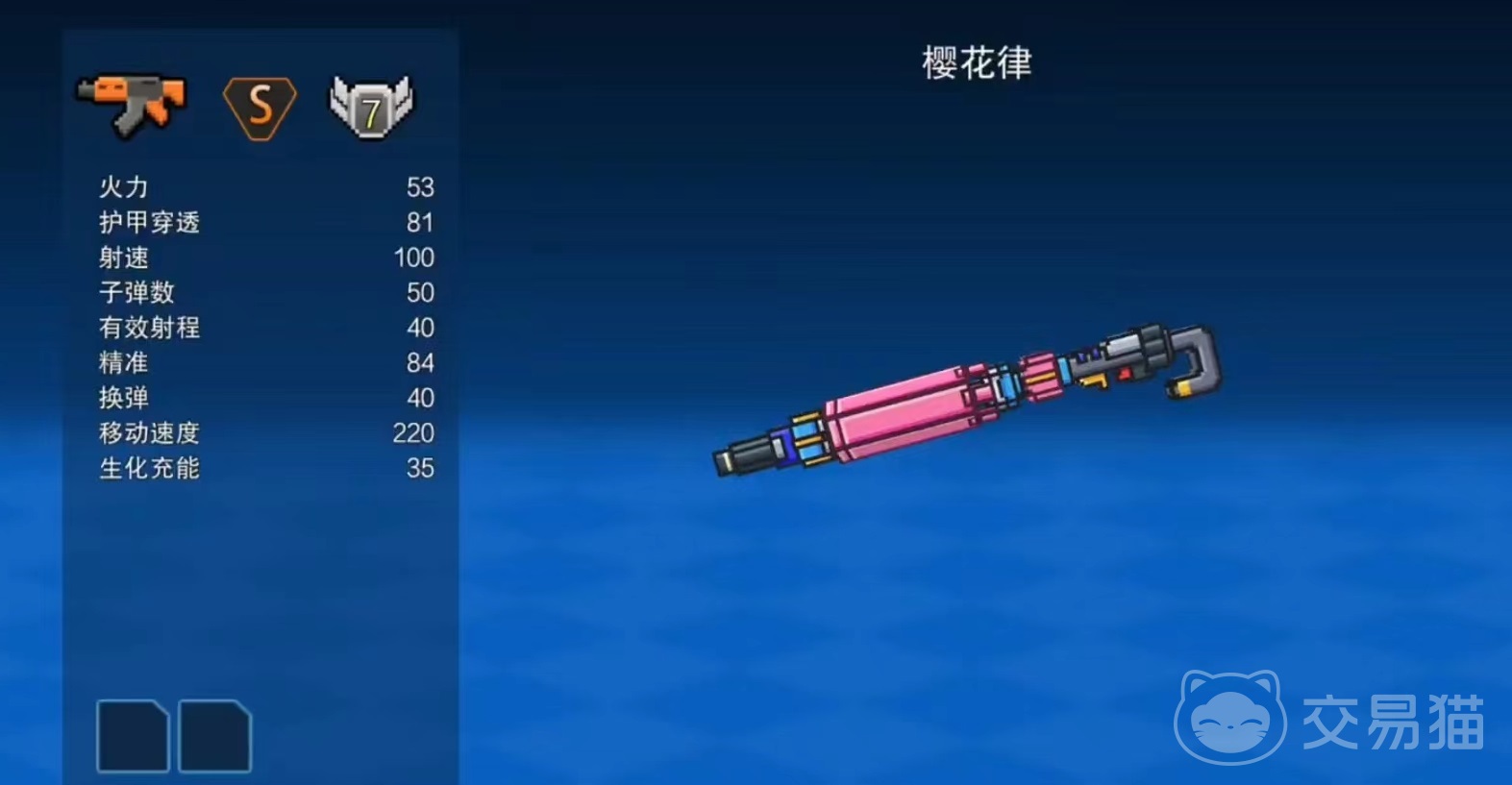 樱花律是属于s级别的步枪,拥有53点火力,81护甲穿透,和100射速,弹匣容量50,有效射程为40,另外的属性精准为84,换弹40,移动速度220,生化充能35。自身在外观方面如同一把已经收起来的伞。