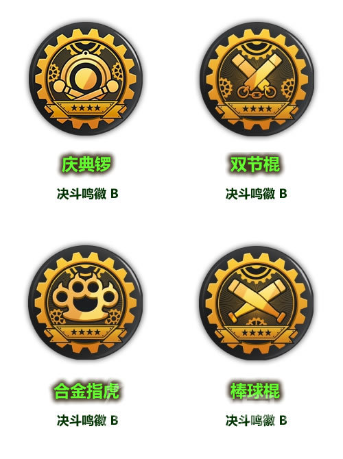 决斗B级鸣徽共有四种。第一是庆典锣;当目标对手的失衡状态消失时,降低他的部分攻击力。第二是双节棍;在打出强化特殊技使目标失衡时,提升失衡效果——哼哼哈嘿,仁者无敌!再次是合金指虎,当目前出场角色使用极限闪避,对敌人打出的失衡值提升。第四是棒球棍,增加普攻对敌人形成的失衡值。