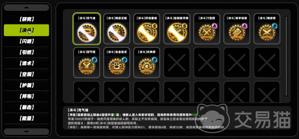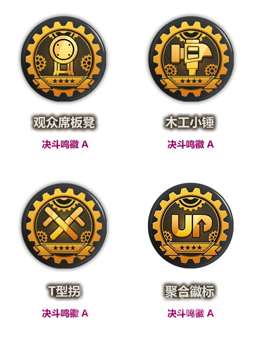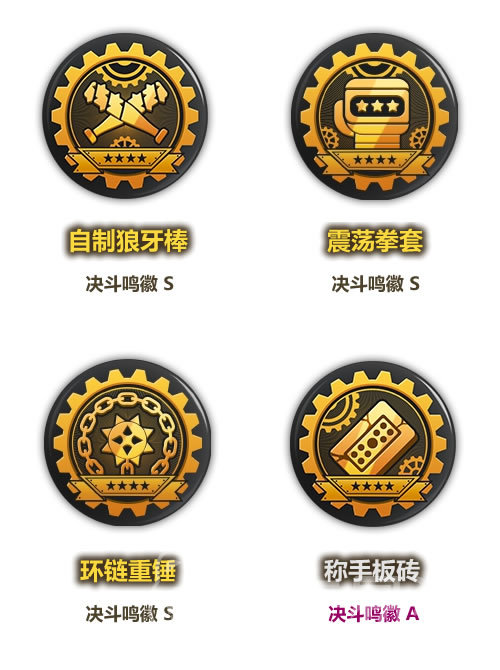 决斗A级鸣徽数量比较多,一共有5种。其一是称手板砖,可以提升连携技打出的伤害效果。其二是观众席板凳,在将目标攻击进入失衡状态时,当前场上队员获得喧响值,全队额外获得2层“冲击”效果。其三是木工小锤;当攻击目标被打出异常状态,所有队员都能得到1层“冲击效果”,如果目标不处于失衡状态时,给他强制加上!其四是T型拐,将对手的失衡状态时长延长。最后是聚合徽标,如果这次挑战你打算以“决斗”鸣徽为主,想要凑出进阶鸣徽,一定要优先选中聚合徽标,因为它能增加所有决斗徽标的出现几率。以上A级鸣徽,除了聚合徽标,都可以进行催化,同时提升最终效果。