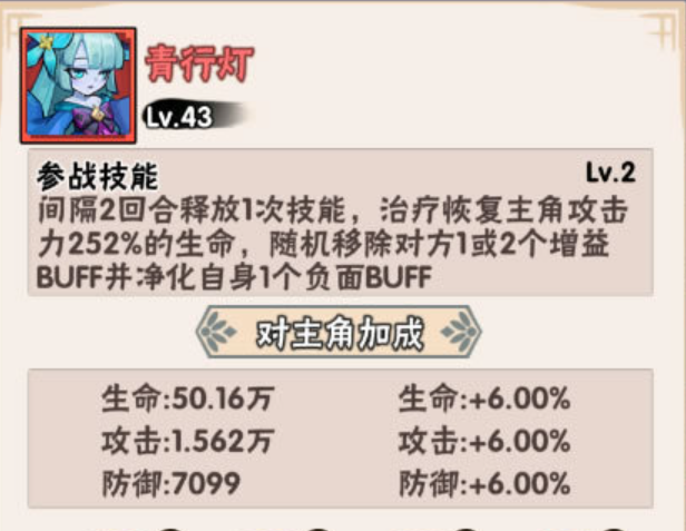 最后就是青行灯吗,定位是辅助治疗角色,每两个回合就可以恢复主角的生命中,这样能保证主角不会瞬间暴毙,恢复效果跟自身攻击力有关,刚好可以和天照的技能相辅相成,并且还可以消除我方的负面buff或者抵消对面的一个正面buff,功能性较强。