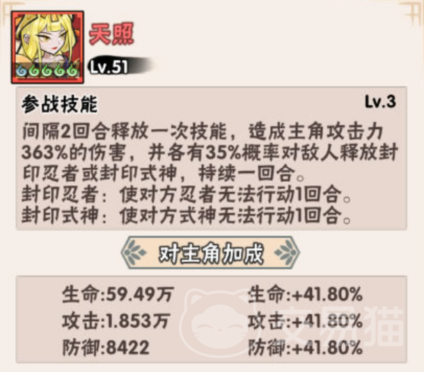 这套阵容的优势就是比较全面,即拥有高爆发的角色承当队伍的输出核心,也拥有治疗角色来保证队伍的容错率,第一个角色便是天照,天照的技能具有很高的单体倍率,能极大程度限制敌方的脆皮单位,而且还有很高的概率能封印住敌方的技能,对于一些很吃忍术的角色来说是比较克制的。