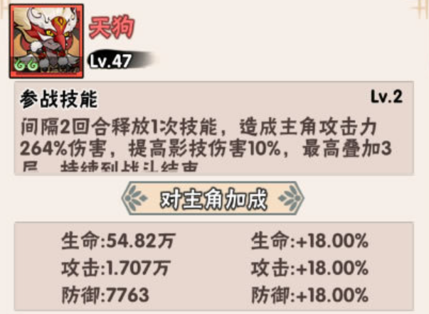 然后就是天狗,天狗属于持续作战的角色,虽然第一次造成的伤害不高,但是可以叠加印记,每层印记可以提高百分之10的伤害,如果能叠加三次的话,那单次伤害的加成是比较恐怖的,几乎可以打穿任何队伍。