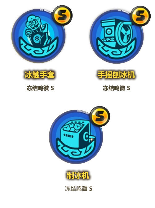 冻结鸣徽S级有三款Buff。第一款名叫冰触手套,在生成冰痕状态时,另增了角色攻击力相关百分比的额外冰属性伤害。第二款叫手摇刨冰机,当碎冰行为触发后,产生一个范围的冰雾环境,大幅降低身处其中敌人的冰防御抗性。第三款叫制冰机,在打出冰冻效果时,小队全体成员获得可以持续30秒的额外大幅暴击提升效果。