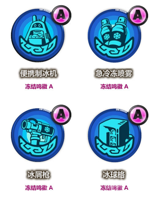 A级冻结鸣徽有四种类型。第一种是便携制冰机,在攻击打出冰冻效果时,当前角色额外产生冰痕状态,但最多产生8层效果,除非已有冰温瓶进阶鸣徽,则层级不受限制。第二种是急冷冻喷雾,当前代理人处于冰痕状态时,积累冰异常属性效率大幅提升。第三种叫冰屑枪,攻击敌人产生的冰冻效果得到延续时长。第四种叫冰球格,在角色打出终结技且造成对敌冰属性伤害时,当前角色获得最多20次的冰痕状态。