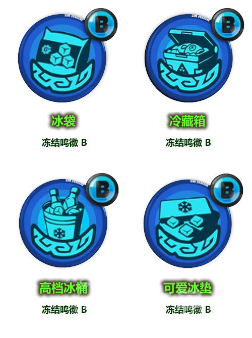B级冻结鸣徽四种。其一是冰袋,在攻击造成冰冻效果时,当前角色防御力提升,可以叠加。其二是冷藏箱,当敌人被打出冰冻状态,受到所有的失衡攻击增加25%幅度。其三是高档冰桶,在角色释放放强化特殊技后,产生最多5层的冰痕状态。其四是可爱冰垫,直接提升小组所有成员的冰属性伤害百分比。