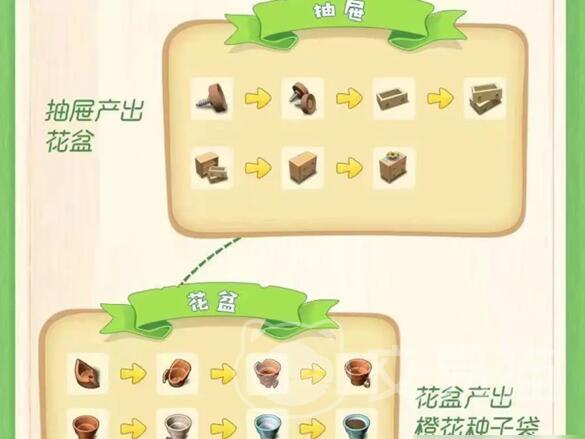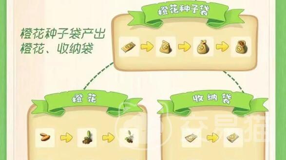 要注意的是,整个游戏的合成过程中,玩家是可以通过使用不同的合成链来合成物品的,比如使用抽屉→花盆,然后就是橙花种子→橙花和收纳袋,这样的链接可以拿到橙花跟收纳袋,在游戏的后续中,这些物品在合成的时候可能会使用到。