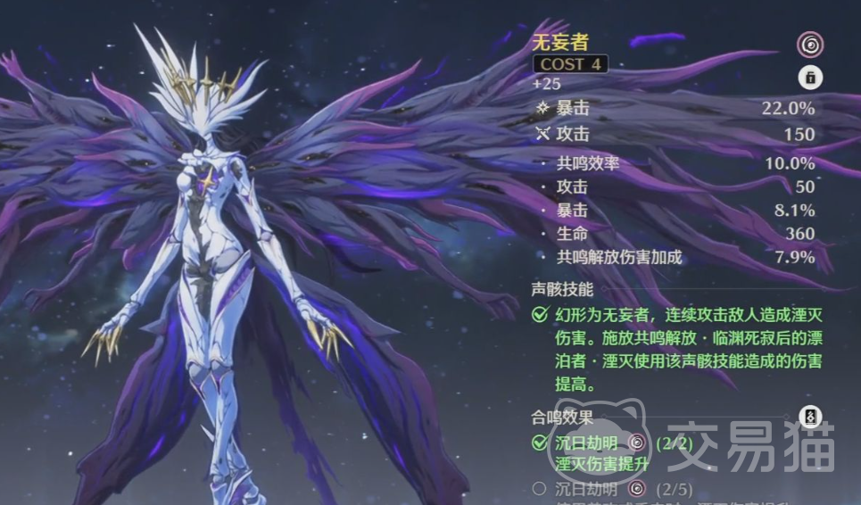 如果玩家想要给副C一类的角色搭配声骸,推荐是使用轻云出月,从而增加技能循环效率并且降低技能的CD,这个套装一共有五件套,在五件套都达成了之后,玩家就能够收获最强的副C金色声骸,如果玩家并不能够集齐五件套,也可以使用无妄者来替代空缺,建议无妄者达到两件套积攒掩灭buff即可。